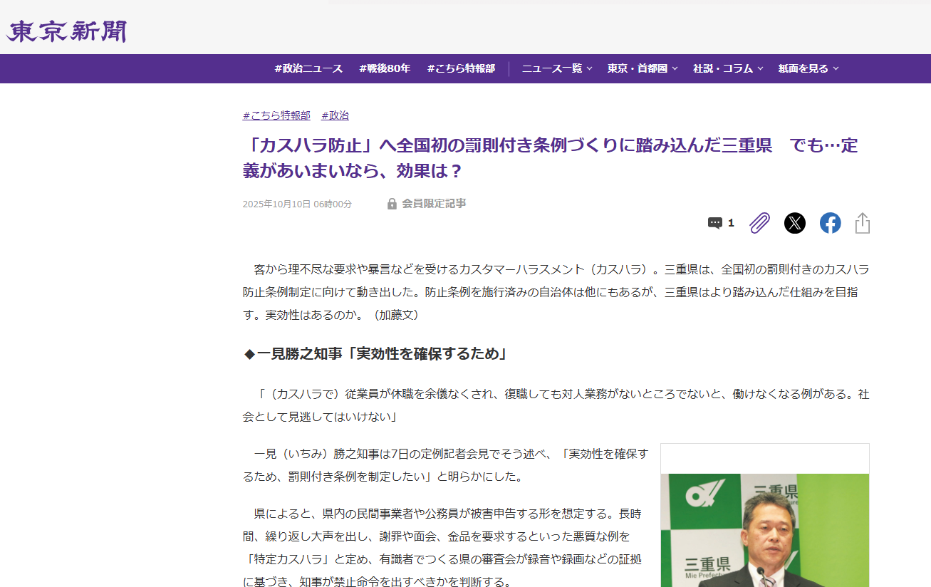 NEWS 2025年10月24日 【告知】こども家庭庁の「こどもへの性暴力」に関する取り組みを行っています(理事桐生) 2025年10月22日 【メディア】東京新聞に取材記事掲載(理事桐生) 2025年10月21日 【メディア】月刊不動産流通2025年11月号(理事宮中) 2025年10月16日 【お知らせ】東京海上日動メディカルサービス㈱とアドバイザリー契約締結 2025年9月25日 【メディア】東洋経済ONLINE に取材記事掲載(理事桐生) 2025年9月19日 【メディア】Ridilover Journal 構造化特集 カスタマーハラスメント 第2回(理事桐生) 2025年9月18日 【告知】2025ソナエルウェビナー(代表島田登壇) 2025年9月11日 【告知】第48期北区ことぶき大学 講座登壇(代表島田) 2025年9月11日 【メディア】日本経済新聞に取材記事掲載(理事桐生) 2025年9月9日 【告知】第24回ダイエット&ビューティーフェア2025 セミナー登壇(代表島田) 2025年9月9日 【メディア】Ridilover Journal 構造化特集 カスタマーハラスメント 第1回(理事桐生) 2025年9月1日 【書籍刊行予告】『カスタマーハラスメント 働く人をどう守るか カスハラ対策の研究・実践・事例』(代表島田・理事桐生) 2025年9月1日 【書籍刊行】『心が疲れたらセルフケア』(すばる舎)(代表島田) 2025年9月1日 【メディア】消費生活情報誌「くらしのパートナー」No.224(9月号)掲載(理事桐生) 2025年9月1日 【盛会御礼】第3回コンバージングテクノロジー研究大会(代表島田) 2025年9月1日 【盛会御礼】第91回日本応用心理学会(大会委員長:桐生理事) 2025年8月29日 【メディア】Ridilover Journal 構造化特集 カスタマーハラスメント(理事桐生) 2025年8月26日 【メディア】幻冬舎GINGERWeb連載(代表島田) 2025年8月7日 【メディア】月刊不動産流通 2025年9月号(代表島田) 2025年7月18日 【メディア】首都圏情報ネタドリ!(理事桐生) 2025年7月15日 【告知】第28回カスタマーサポートシンポジウム(代表島田) 2025年7月11日 【報告】「あんしんいきいきラボ」第一回研究会が開催 2025年7月6日 【メディア】全国賃新聞に記事掲載(理事桐生) 2025年6月23日 【メディア】幻冬舎GINGERWeb連載(代表島田) 2025年6月19日 【メディア】『産業保健と看護』(代表島田) 2025年6月17日 【講演】6/17 働き盛り世代のための健康公開講座(理事桐生) 2025年6月1日 【メディア】大阪市人権だより「KOKOROねっと」第59号(弊所理事桐生) 2025年5月4日 【プレスリリース】日本初、組織のカスハラ対応を認証する 「あんしんいきいき職場格付け認証」を 企業、地方自治体3団体が取得 2025年5月2日 【メディア】「大学時報」第422号(代表島田) 2025年5月1日 【メディア】幻冬舎GINGERWeb連載(代表島田) 過去の記事はこちら